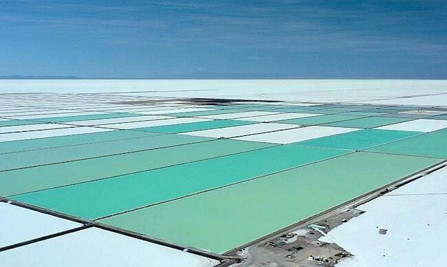 Vista aérea das piscinas de evaporação do complexo estatal de extração de lítio, na zona sul do Salar de Uyuni, na Bolívia | PABLO COZZAGLIO / AFP