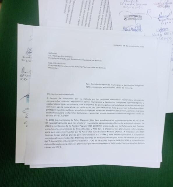 La misiva al presidente y vicepresidente electos de Bolivia cuenta con más de 100 firmas; también reseña el proceso que determinó las normativas que declaran a Palos Blancos y Alto Beni como municipios agroecológicos libres de actividad minera (leyes municipales N°233 y N°97 de 2021). “En 2023, la sentencia de la Acción Popular 004-2023/AP, presentada por la Defensoría del Pueblo, exhortó a los municipios de Palos Blancos y Alto Beni a presentar sus planos georreferenciados para que sean restringidos por la Autoridad Jurisdiccional Administrativa Minera (AJAM)”.