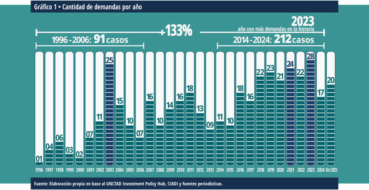 Las demandas inversor-Estado se han multiplicado en las últimas dos décadas: de un total de 6 casos conocidos bajo tratados en 1996, se pasó a 1401 casos conocidos hasta finales de 2024. De ese total, los países de América Latina fueron demandados en 399 ocasiones hasta el 31 de diciembre de 2024, lo que representa un 28,5% de las demandas inversor-Estado conocidas a nivel mundial. Al cierre de este informe (15/10/2025), los países de la región habían recibido 20 demandas adicionales, alcanzando un total de 419 casos a mediados de octubre de 2025.
