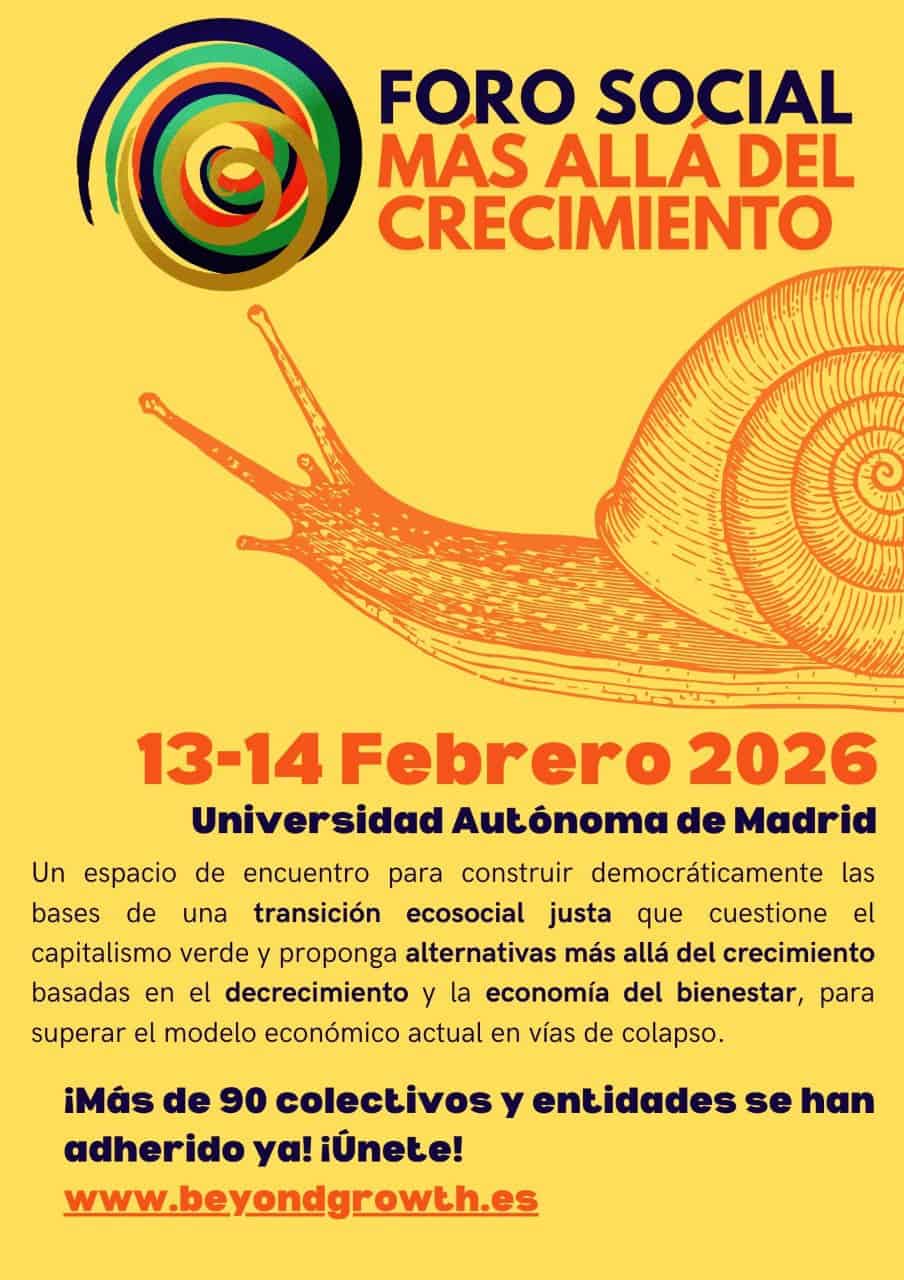 Tras el éxito de la Conferencia Más Allá del Crecimiento, que reunió el pasado septiembre a más de 300 personas en el Congreso de los Diputados y cerca de mil participantes de manera online, los 94 colectivos adheridos a la declaración organizan la primera sesión del Foro Social Más Allá del Crecimiento los días 13 y 14 de febrero en la Universidad Autónoma de Madrid. Las inscripciones y las convocatorias a sesiones y talleres paralelos ya están abiertas a través de su página web .