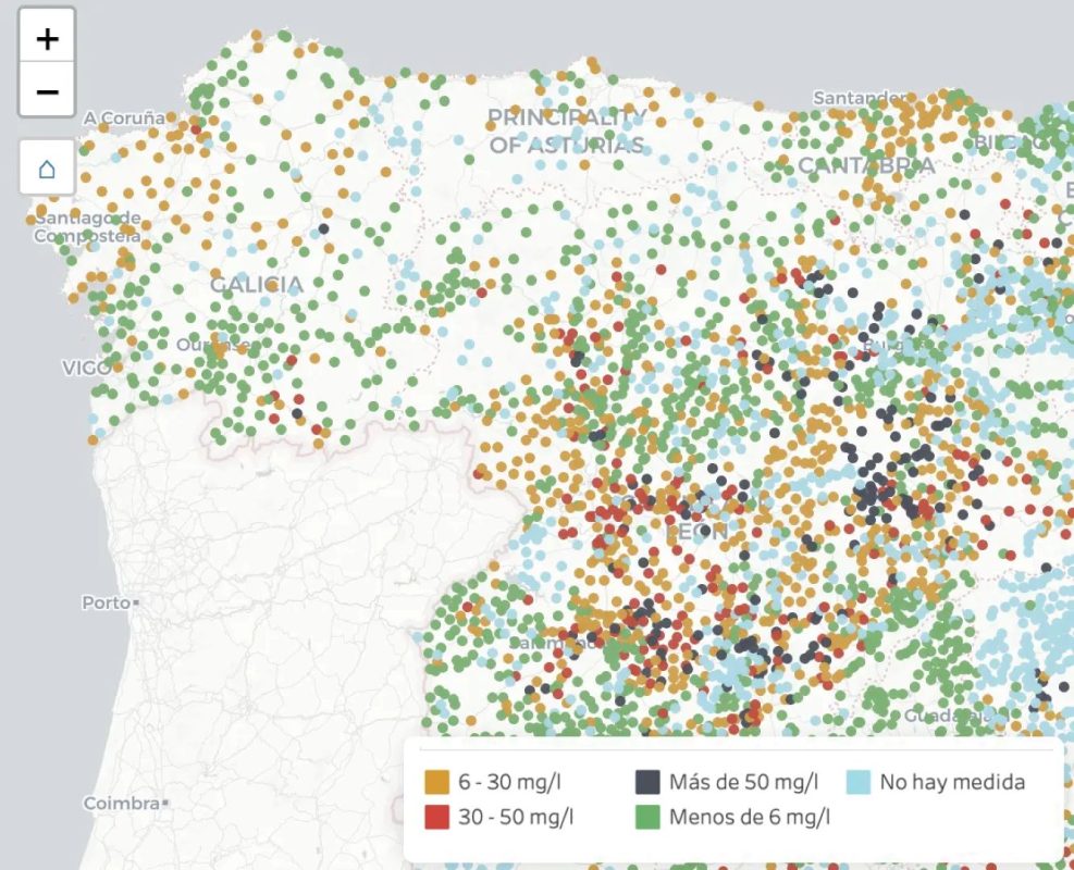 Esta herramienta recoge “la última información consolidada (referente a 2024)” y publicada por el Sistema de Información Nacional de Aguas de Consumo (SINAC) del Ministerio de Sanidad. Puede consultarse para conocer la calidad del agua relacionada con la concentración de nitratos de los municipios. Dice Greenpeace que el mapa interactivo permite indagar en la preocupante situación que se vive en España.