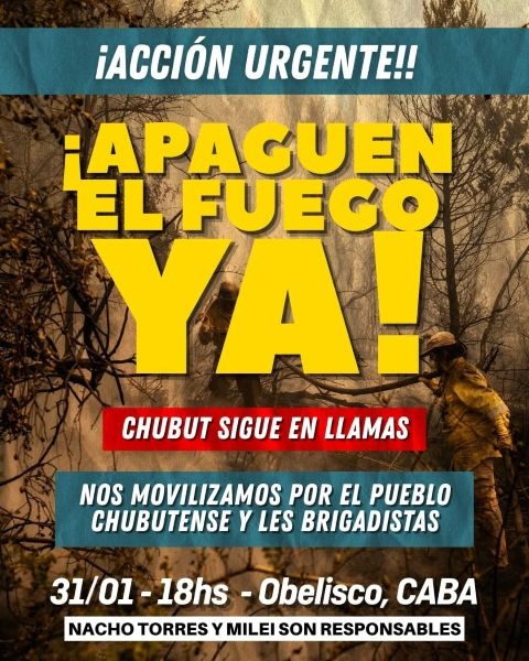 Desde distintos espacios de defensa de los bosques y el cuidado del ambiente se está convocando a una nueva concentración para este sábado a las 18hs en el obelisco. En la Patagonia ya se incendiaron 400.000 hectáreas, mientras brigadistas en condiciones precarias, junto a vecinas y vecinos hacen frente al fuego. La convocatoria, además de visibilizar la situación y la desidia gubernamental tanto por parte del presidente Milei como del Gobernador Torres, buscará también profundizar un compromiso con nuestro territorio, desde la solidaridad con quienes se encuentran en el territorio hasta la defensa de la Ley de Glaciares.