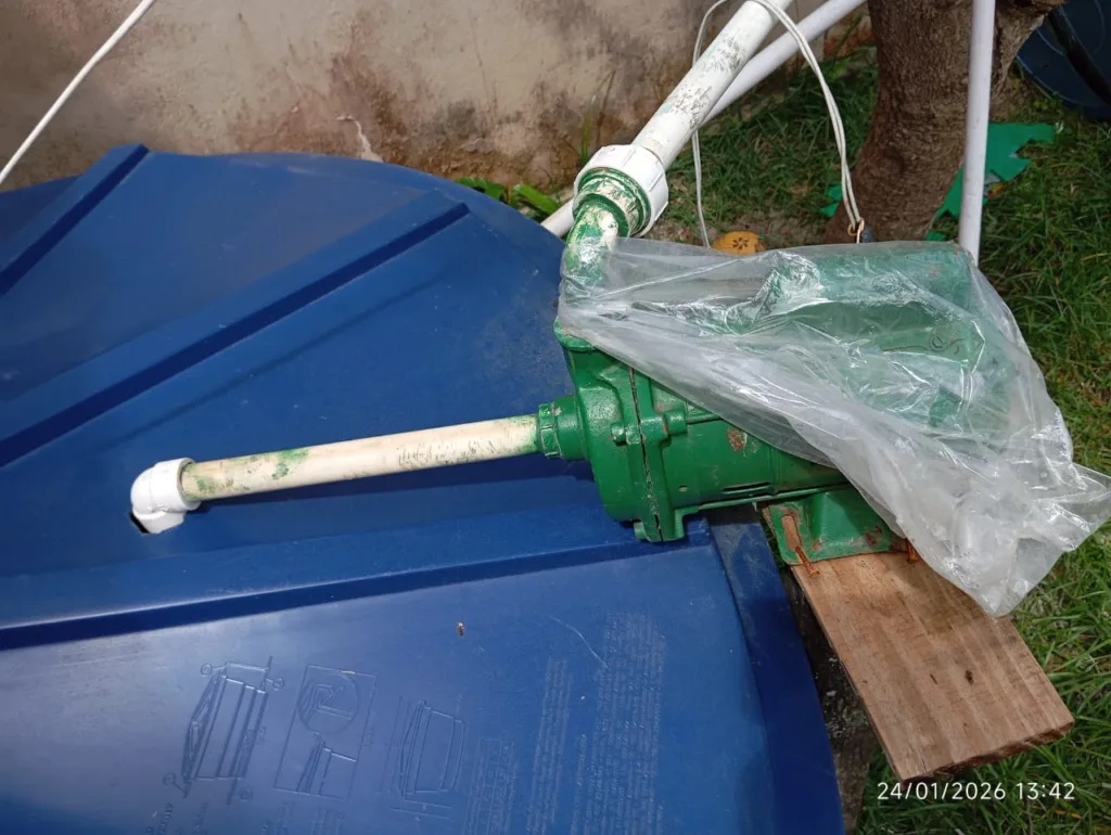 Água chega sem força nas comunidades do entorno o Porto do Açu; moradores precisam usar bomba elétrica acoplada em caixas no chão para ter água encanada | Crédito: Arquivo pessoal
