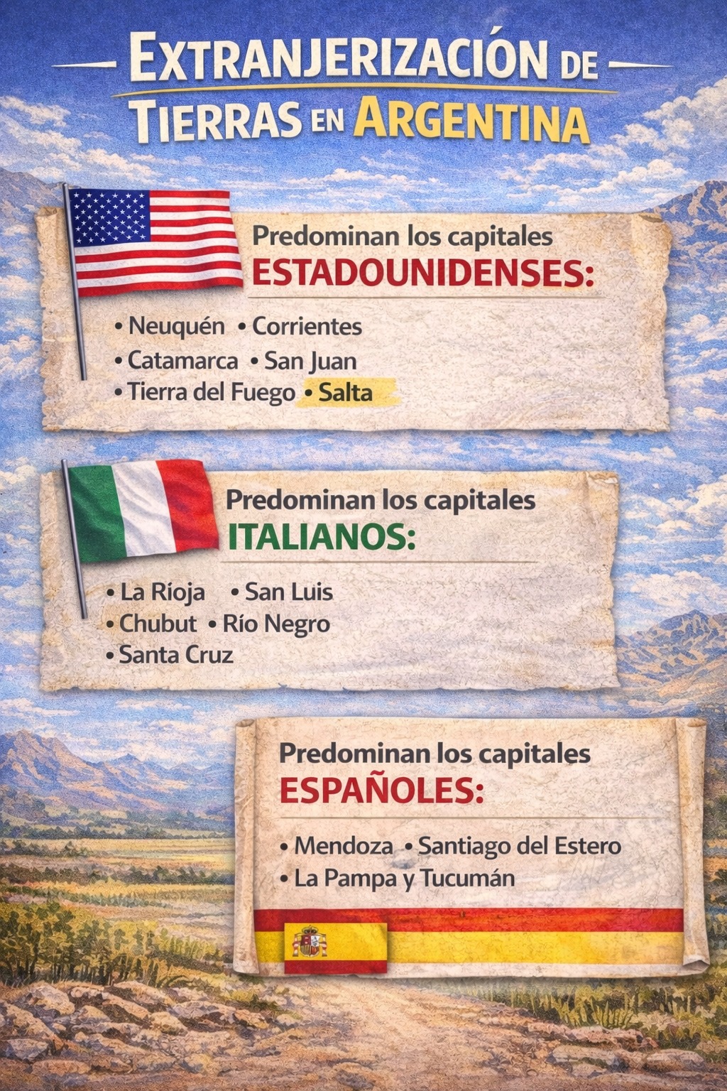 - En Neuquén, Corrientes, Catamarca, San Juan, Tierra del Fuego y en Salta -una de las provincias con mayor índice de extranjerización de tierras- predominan los capitales estadounidenses.