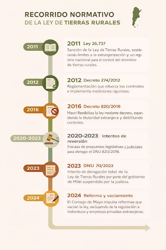 La Ley de Tierras Rurales N.º 26.737, sancionada en diciembre de 2011, constituyó un hito en la regulación del acceso a la tierra y en la protección del territorio nacional frente a los procesos de extranjerización. Su espíritu central fue reconocer a la tierra rural como un recurso estratégico, limitado e irreproducible, cuya tenencia debía ser objeto de regulación estatal en función de la soberanía, la seguridad territorial y el desarrollo nacional. La ley operó como un freno al proceso de extranjerización, aunque no lo revirtió: las tierras que ya se encontraban en manos extranjeras mantuvieron esa condición.