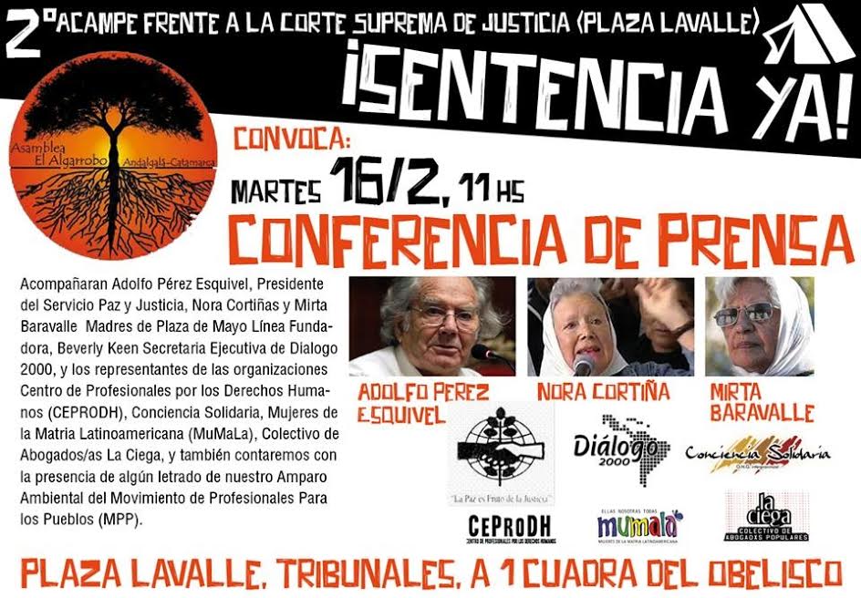 La Asamblea el Algarrobo convoca a conferencia de prensa, para el día Martes 16/02 a las 11:00 hs. en el 2do. ACAMPE POR LA VIDA que se lleva adelante en Plaza Lavalle, frente al Palacio de Justicia de la Nación en reclamo de una SENTENCIA YA.