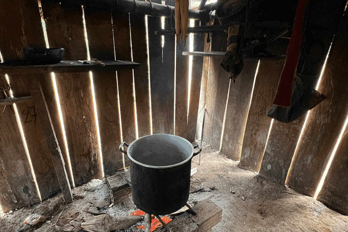 Desde que quedó solo, Buca se aferra a los rituales pequeños. Recoge almendras cuando la temporada lo permite, siembra arroz, lo cosecha y lo almacena en su choza, donde tiene una cama hecha de troncos, un colchón relleno con lana de oveja, un banco de madera, un machete con mango gastado y un colgador de ropa hecho de bejucos.