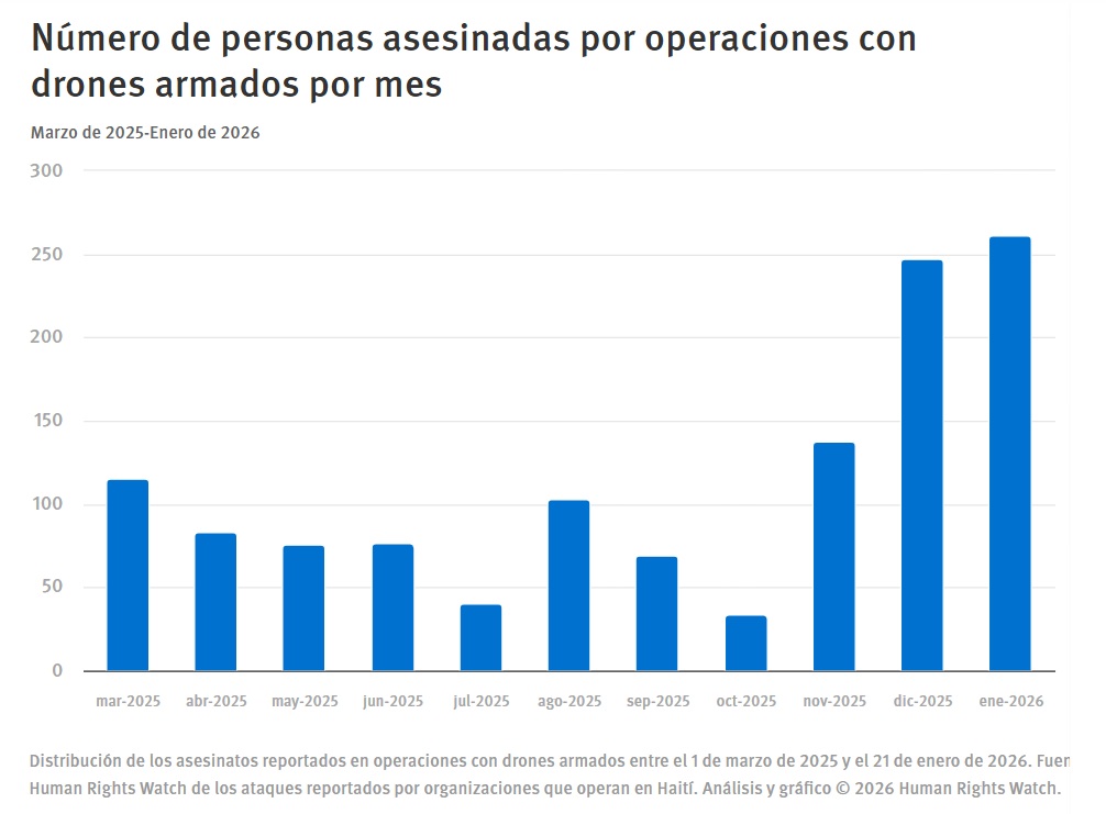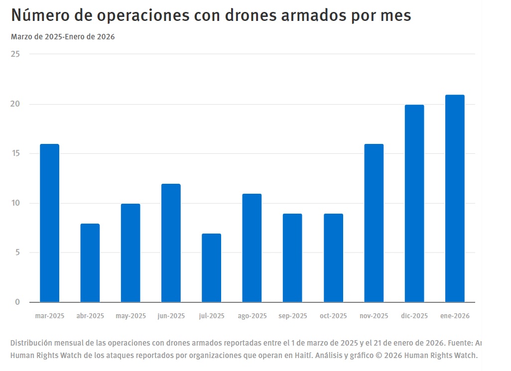 El número de ataques con drones armados en Puerto Príncipe ha aumentado significativamente en los últimos meses: 57 casos han sido reportados entre noviembre de 2025 y el 21 de enero de 2026, casi el doble de los 29 reportados entre agosto y octubre de 2025. Más del 40 % de los asesinatos reportados tuvieron lugar entre el 1 de diciembre y el 21 de enero. El promedio de personas asesinadas por operación es de 8,8, mientras que la operación más letal dejó 57 personas asesinadas.