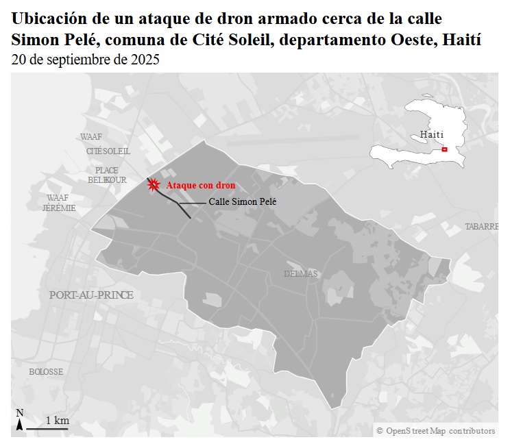 Ubicación de un ataque con dron armado en el barrio Simon Pelé de Puerto Príncipe, el 20 de septiembre de 2025. Fuente: Límites administrativos: Centre National de l’Information Géo-Spatiale (CNIGS). Si bien Simon Pelé está oficialmente clasificado como un barrio dentro de la comuna de Delmas, fuentes locales lo consideran parte de Cité Soleil. Sección de Servicios de Información sobre el Terreno (FISS) de la OCHA. Análisis y gráfico © 2026 Human Rights Watch.