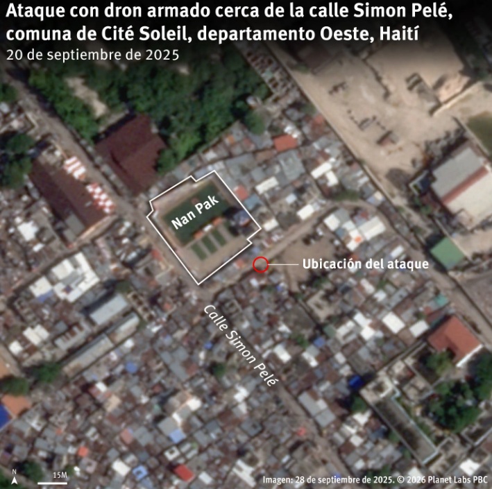 Geolocalización de Human Rights Watch de un ataque con dron armado ocurrido en el barrio Simon Pelé de Puerto Príncipe, el 20 de septiembre de 2025. Imagen: 28 de septiembre de 2025 © 2026 Planet Labs PBC. Análisis y gráfico © 2026 Human Rights Watch.