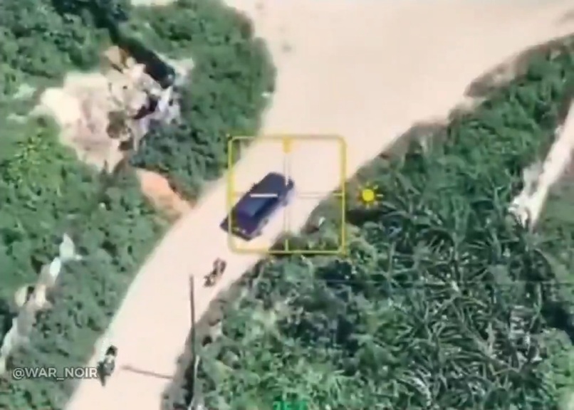 Video publicado en la red social X el 31 de mayo de 2025 que muestra un ataque con dron armado contra un patio en Village de Dieu.