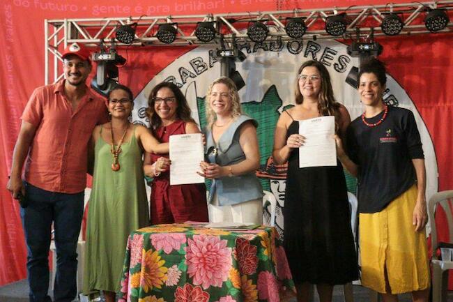 Em uma mesa simbólica e potente, composta só por mulheres, o Projeto de Recuperação Econômica Agroecológica da Bacia do Rio Doce foi assinado por Maíra Santiago, coordenadora da Cooperativa de Trabalho da Agricultura Camponesa de Minas Gerais (Coopertrac); Luiza Monteiro de Souza, diretora financeira do Núcleo de Assessoria às Comunidades Atingidas por Barragens (Nacab); Patrícia Bourguignon, gerente de projetos da Fundação Espírito-santense de Tecnologia (Fest); E Adriana Aranha, gerente extraordinária de Recuperação da Bacia do Rio Doce, representante da Agência Nacional de Assistência Técnica e Extensão Rural (Anater) e do Ministério do Desenvolvimento Agrário e Agricultura Familiar (MDA).