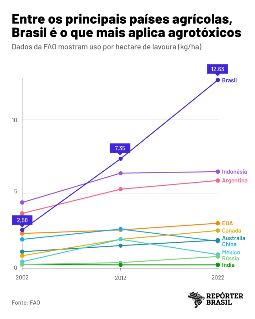 Procurada pela Repórter Brasil, a Bayer afirmou em nota que o glifosato é usado “com segurança e sucesso” no mundo todo há mais de 40 anos e que os principais órgãos reguladores “concluíram repetidamente” que os produtos “podem ser usados com segurança conforme as instruções de bula”.