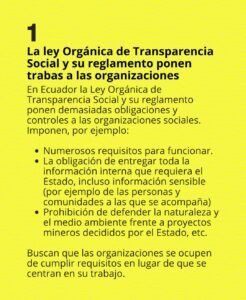 En Ecuador, organizaciones sociales rechazan la nueva Ley de Transparencia Social que entró en vigor en 2025 y que fue promovida por el gobierno de Daniel Noboa, que ha permitido restricciones legales y bloqueo de cuentas bancarias contra organizaciones de la sociedad civil. Denuncian que se usa para controlar a las organizaciones sociales, lo que hace que haya menos libertad, más miedo y menos defensa de derechos, eso afecta directamente a toda la sociedad. Por eso, diversas organizaciones sociales pidieron a la Corte Constitucional de Ecuador que actúe y proteja sus derechos, y por el momento, no han tenido respuesta del máximo tribunal del país. Las “leyes anti-ONG” en América Latina quiere controlar, restringir y debilitar a quienes defienden derechos humanos. No es aislado, es un patrón regional. Lxs principales afectadxs han sido liderazgos indígenas cuya labor ha sido esencial en la defensa de los bienes comunes y territorios. Así, como organizaciones que defienden el medio ambiente frente al extractivismo atroz que avanza impunemente en los territorios.