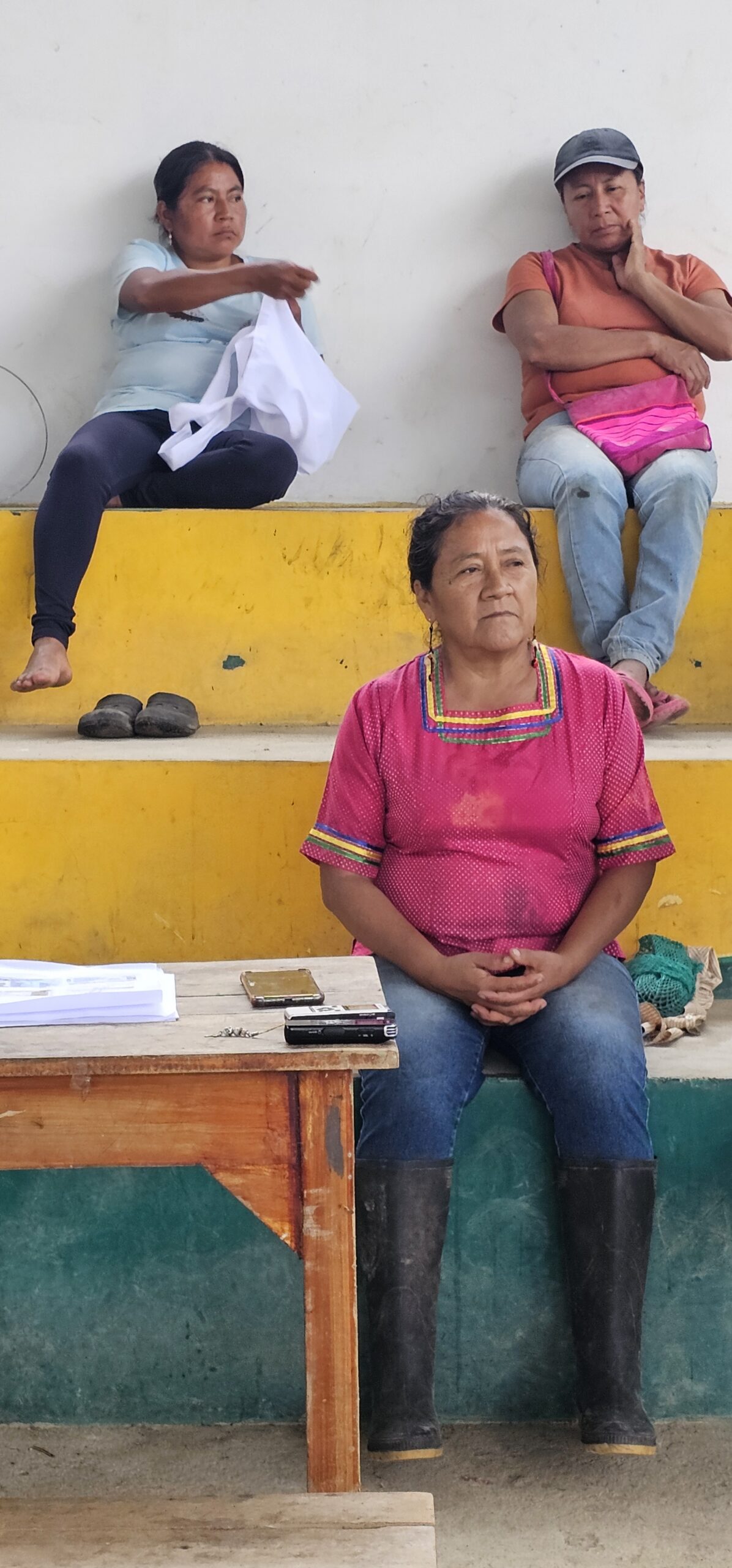 Linda Tapuy, presidente de la comunidad, también está sentada detrás de la vieja mesa de madera. Dice que “las mamitas” del pueblo recogen el agua del río en baldes y dejan que se asiente para poder utilizarla.