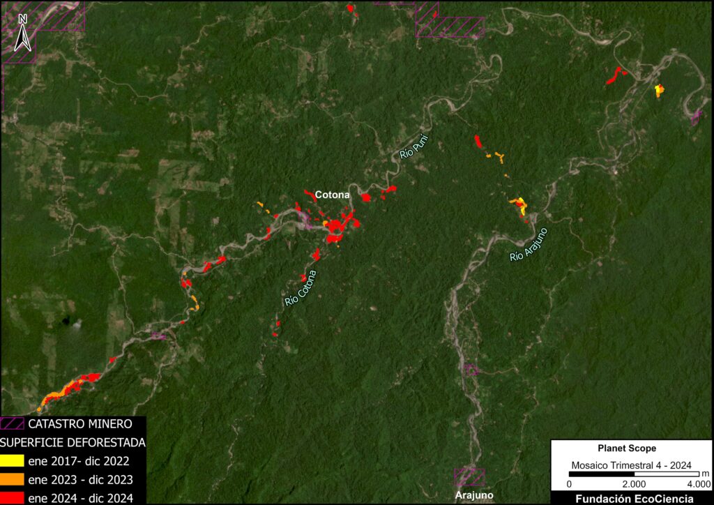 Mapa que muestra el aumento de la presencia minera en los bosques primarios. Mapa: Amazon Conservation/MAAP; EcoCiencia, Planet