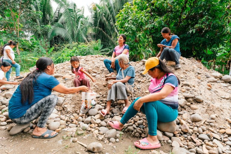 Mujeres y niñas de Capirona se juntan para recolectar piedras y hacer los filtros de agua, un experimento de la comunidad en alianza con una fundación internacional. Foto: cortesía Fundación Yachana