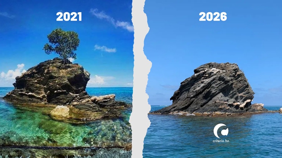 El centenario “árbol solitario”, un mangle que creció sobre una roca junto al Cayo Menor, murió recientemente. Pobladores garífunas señalan que era uno de los principales atractivos de los tours acuáticos. Sin embargo, su ubicación coincidía con zonas usadas para la grabación de realities, lo que generaba tensiones con la producción y la Fundación Cayos Cochinos. Algunos no descartan que el daño haya sido provocado. (Foto: Criterio.hn-Jorge Burgos).