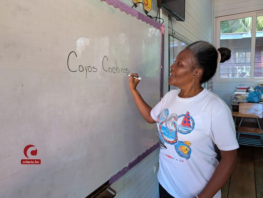 La profesora Cándida Marín imparte clases en la escuela de East End, un centro educativo prácticamente unidocente donde estudian alrededor de 35 estudiantes de distintos grados. Muchos estudiantes deben cruzar el mar en lancha desde otros cayos para asistir a clases cuando el clima lo permite. (Foto: Criterio.hn-Emy Padilla).