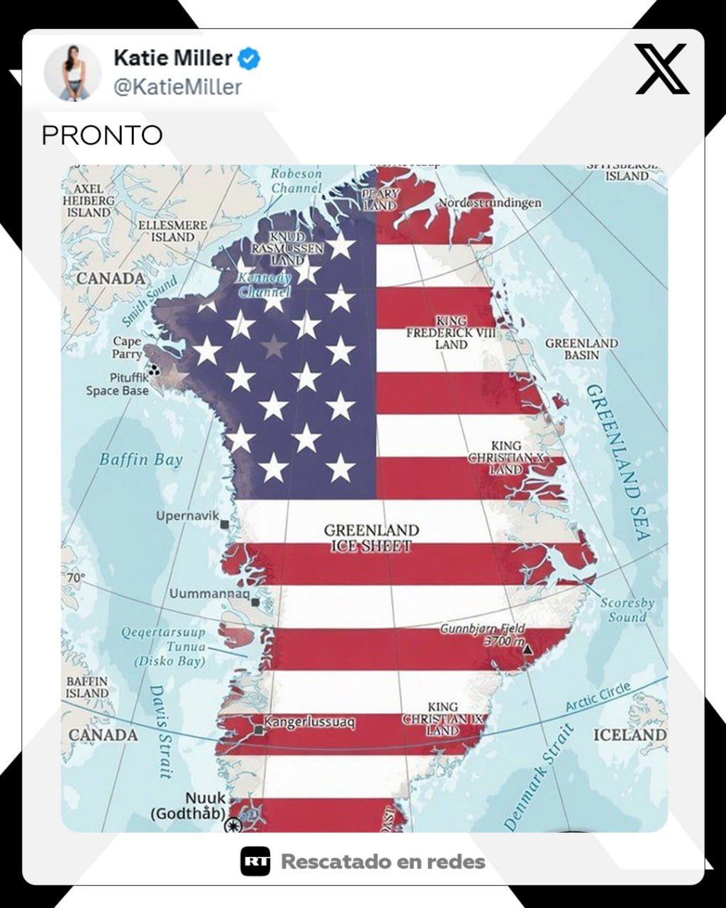 Mientras el gobierno danés protestaba por estas declaraciones (con las que Estados Unidos viene insistiendo hace meses), la esposa del subjefe de gabinete norteamericano publicó en redes sociales un mapa de Groenlandia pintado con la bandera yanki y las palabras “soon” (pronto). Una provocación en toda línea.