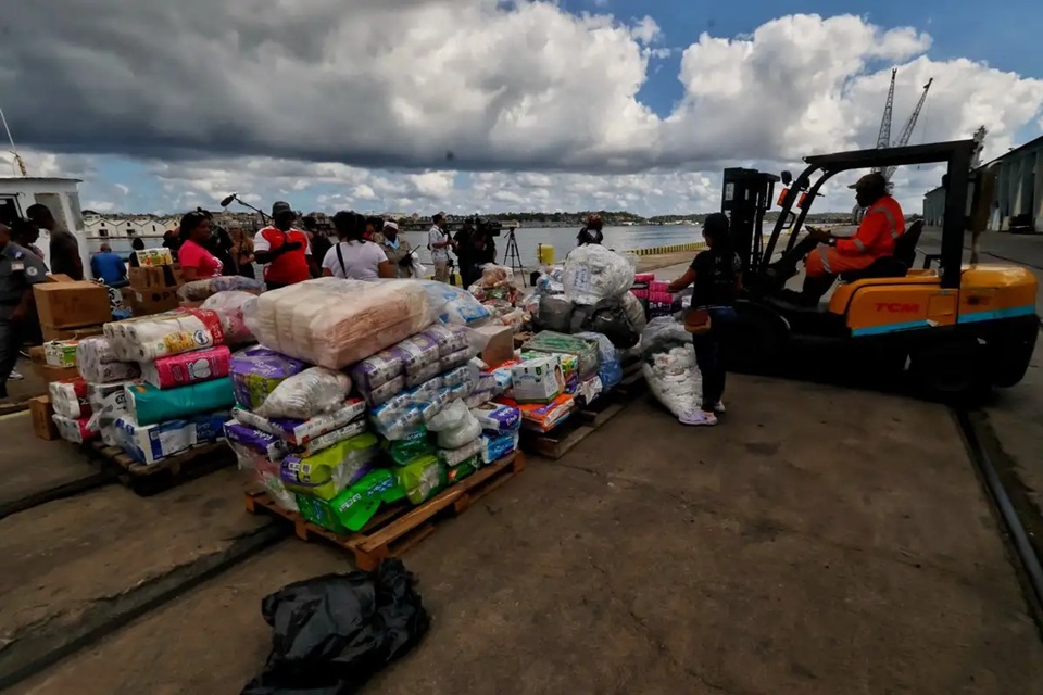 Desembarco de las toneladas de ayuda humanitaria que se recibió en La Habana. Antes, hubo un acto de recepción y un festival. Foto Marco Pelaéz