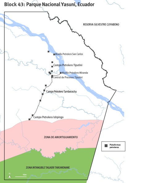 En 2013, la Asamblea Nacional del Ecuador declaró la explotación petrolera en los Bloques 31 y 43 dentro del Parque Nacional Yasuní como de “interés nacional”, dejando sin efecto las prohibiciones de extracción en parques nacionales. El Bloque 43, con la mayor producción petrolera del Yasuní, contiene 247 pozos distribuidos en tres campos. Ishpingo, el campo ubicado más al sur, es el más nuevo y productivo, y el más cercano a la zona de amortiguamiento de los pueblos indígenas.