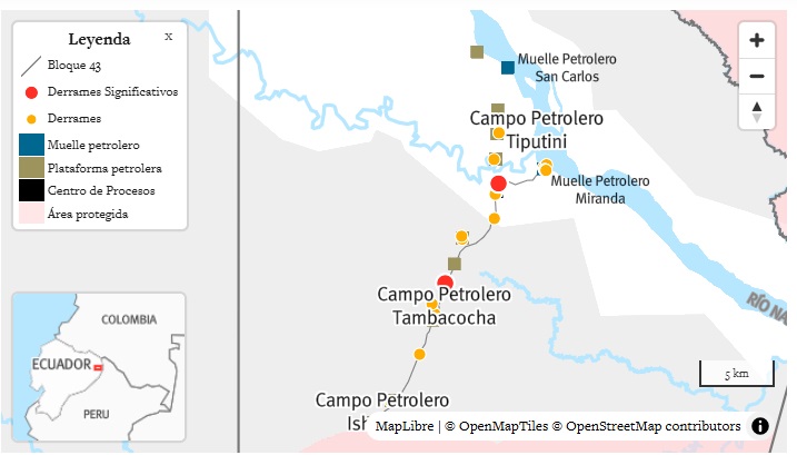 Según informes oficiales de derrames divulgados por Petroecuador, produjeron 29 derrames en el Bloque 43 entre 2016 y 2024, el último año con datos disponibles. Sin embargo, en el informe de la empresa de 2024 sobre la viabilidad del cierre del bloque, sostuvo que “no se han registrado derrames”, clasificando los 29 incidentes como “eventos operacionales” que, según dijo, “no han afectado al ambiente” y fueron contenidos adecuadamente.