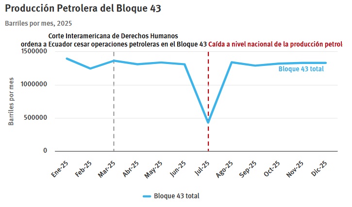 Datos de la empresa estatal Petroecuador mostraron que, salvo por un período en julio de 2025 en el que la producción petrolera nacional cayó debido a daños en oleoductos tras un deslizamiento de tierra, la producción de crudo del Bloque 43 se mantuvo constante durante todo 2025, con un promedio de 1,2 millones de barriles de petróleo extraídos cada mes.