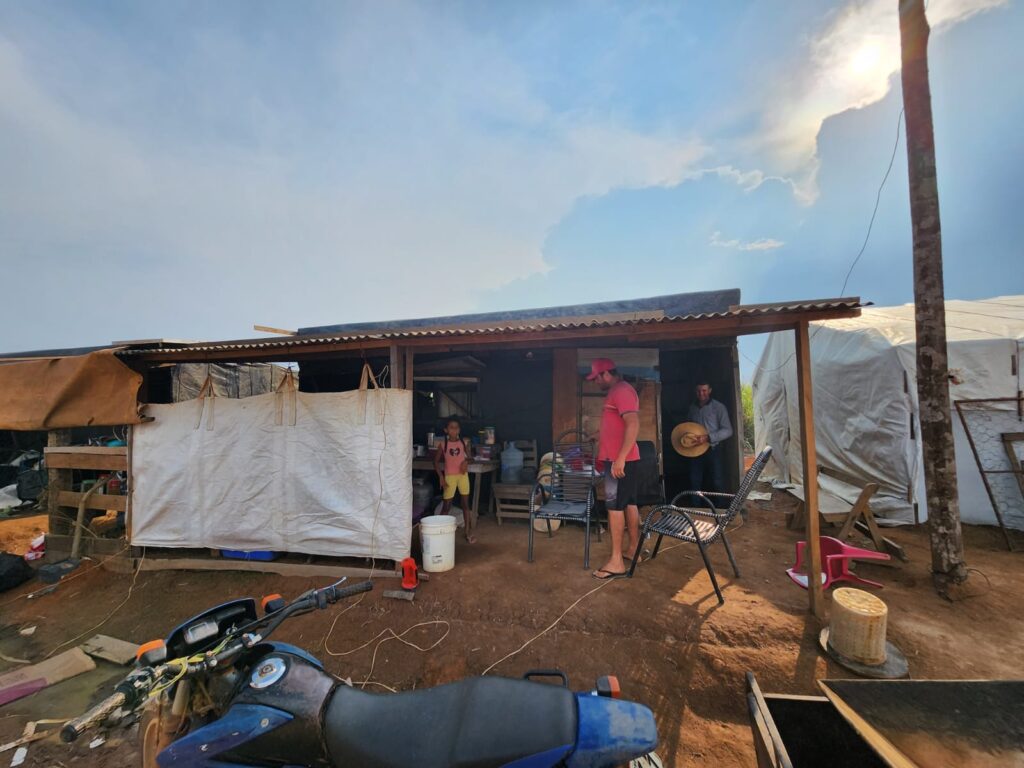 As 74 famílias vivem em barracos de lona montados à beira de uma estrada de terra, diante da porteira da fazenda. Não há acesso regular a água potável — a que eles recebem de caminhões-pipa da prefeitura é considerada imprópria para beber. Moradores do acampamento relatam caminhadas de cerca de seis quilômetros até sítios vizinhos para conseguir água. Na seca, a poeira levantada pelo vento cobre as panelas e os colchões. Na chuva, os barracos alagam.