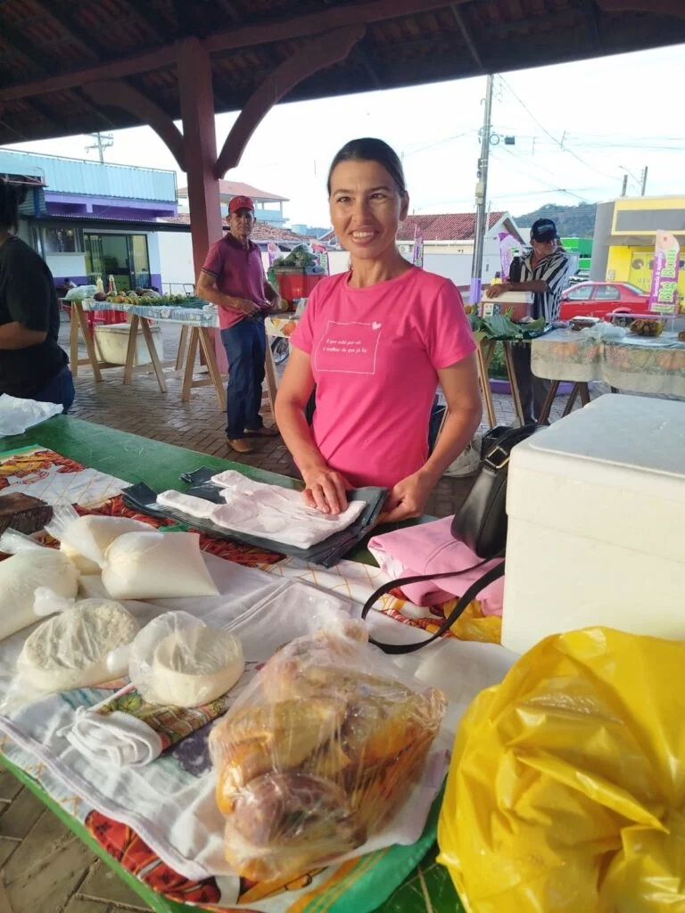 Las mujeres, que participan en la feria desde hace muchos años, incluso antes de la pandemia, elaboran quesos, panes y pasteles con recetas familiares, además de vender pollos. Destacan la diferencia entre sus productos y los del mercado, haciendo hincapié en su frescura y la ausencia de conservantes. Para Elisângela, la feria representa un importante ingreso adicional para su familia y un espacio donde la interacción con los clientes y otros vendedores fortalece su autoestima.