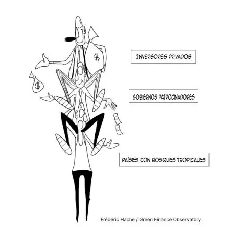 El TFIF pretende recaudar el dinero funcionando como un banco: espera pedir prestado dinero y luego invertirlo a cambio de obtener ganancias. Así que, para empezar, el TFIF necesita recaudar el dinero. Se ha calculado que en total, el TFIF necesitará 125 mil millones de dólares para poder pagar 4 dólares por hectárea a los países que cumplan con los requisitos para recibir pagos por proteger los bosques tropicales (3). Se espera que 25 mil millones de dólares procedan de fuentes públicas, principalmente aportes de gobiernos del Norte Global y filántropos como la Fundación Minderoo, respaldada por el multimillonario australiano de la minería Andrew Forrest (4). Este dinero público puede adoptar la forma de subvenciones o, lo que es más probable, se puede dar en forma de préstamos a largo plazo, lo que significa que los gobiernos del Norte también obtendrán ganancias de sus aportes y recuperarán el dinero transcurridas algunas décadas. El TFIF tendrá que asegurar al menos una parte significativa de estos fondos públicos para poder comenzar a recaudar los 100 mil millones de dólares de capital privado. ¿Por qué? Porque los fondos públicos se usarán como garantía de riesgo del capital privado. Sin los fondos públicos para amortiguar los riesgos, el costo de pedir prestados 100 mil millones de dólares en capital privado sería muchísimo mayor.
