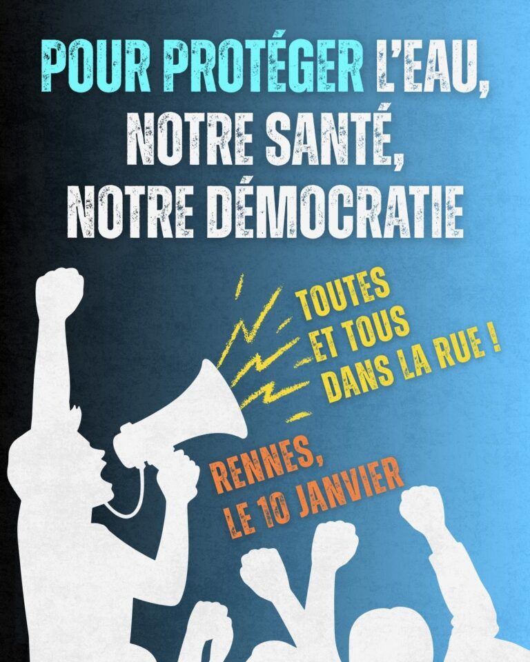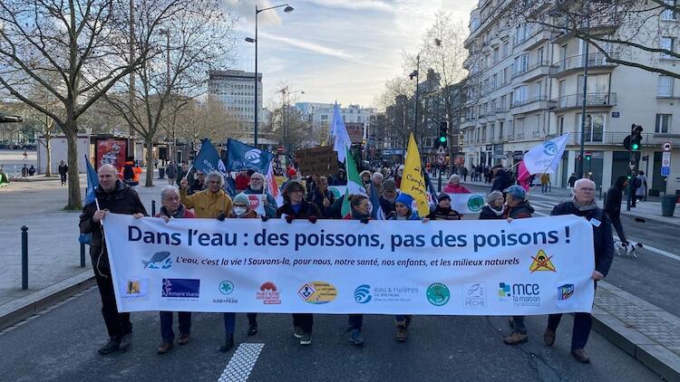 El 10 de enero, en Rennes, la Confédération Paysanne se manifestó junto a federaciones de pescadorxs, asociaciones de defensa del medio ambiente y asociaciones de defensa de las víctimas de los pesticidas (unas sesenta organizaciones) para recordar que el agua es un bien común y que su gestión debe ser transparente y respetuosa con la legislación. En territorio francés, la agroindustria ejerce múltiples presiones para impedir nuevas prohibiciones de pesticidas y evitar que se aplique correctamente la ley que prohíbe los tratamientos en las zonas de captación de agua potable.