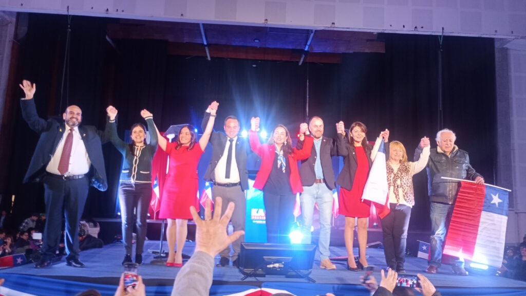 Marco Melo de la mano de la diputada Chiara Barchiesi y junto a otros candidatos en acto de campaña de Jose Antonio Kast en Puerto Montt. Septiembre, 2025. Foto: Federico Valdés Bize.