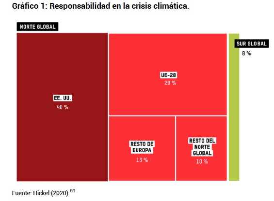La responsabilidad de causar el cambio climático es groseramente desigual entre países y más aún si se estima en la diferencia entre la cantidad de habitantes y su situación económica. De todos modos, si la estimación se hace solamente entre países, más de las dos terceras partes de los gases de efecto invernadero emitidos desde 1850 fueron emitidos por solo 10 países, con Estados Unidos —que usa más del 25 % de la energía global con 4 % de la población global— como principal culpable.