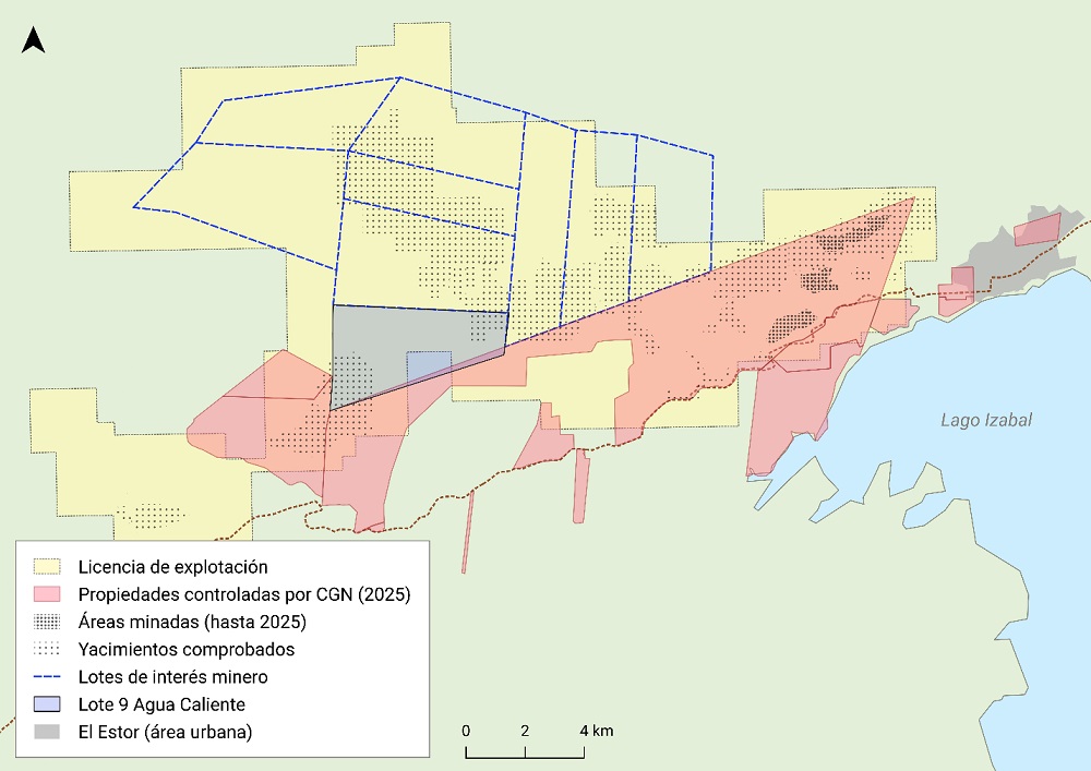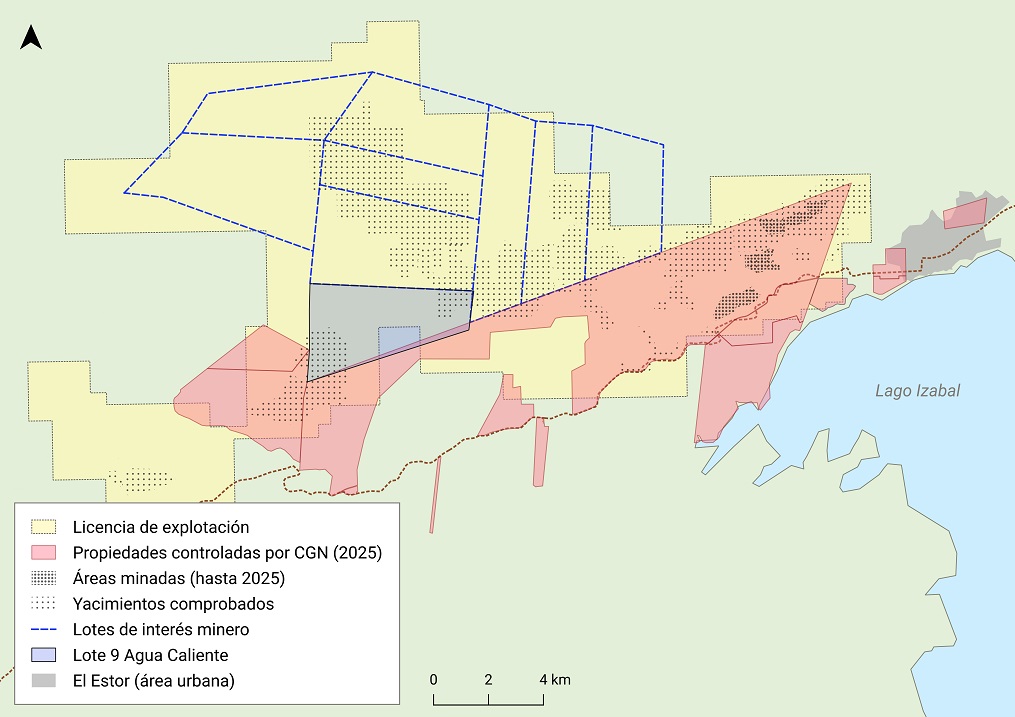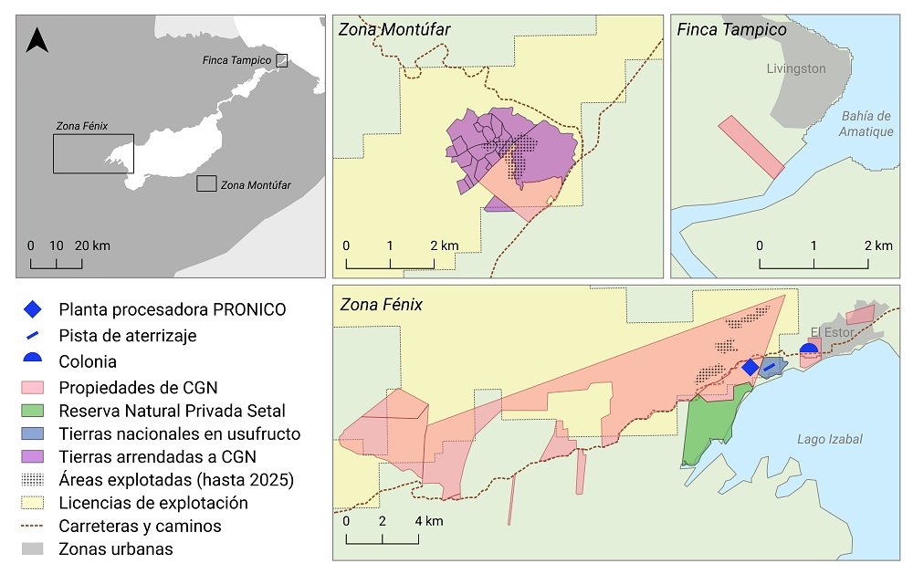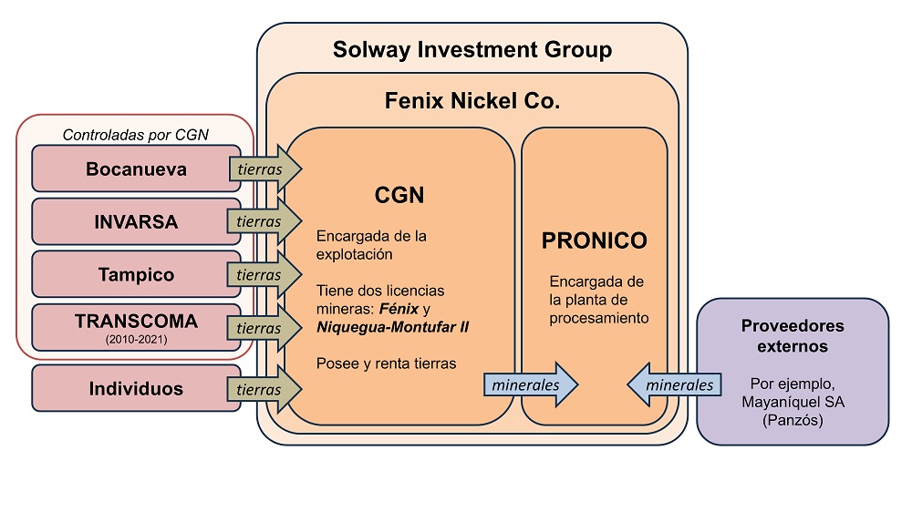 Hoy en día, “CGN” es, más que una sola entidad, una red de cinco empresas (Figura 1). La primera, CGN propiamente dicha, gestiona las operaciones mineras y posee dos licencias (Figura 2). La planta de procesamiento es operada por PRONICO. Tanto CGN como PRONICO pertenecen a la Fénix Nickel Company, registrada en Estados Unidos y, en última instancia, propiedad de Solway Investment Group, registrada en Suiza pero de capital ruso. Las otras tres empresas del entorno corporativo de CGN son menos conocidas: INVARSA, Bocanueva, y Tampico. Aunque tengan distintas historias, esas tres empresas están de facto bajo el control de CGN y son ellas las dueñas de la mayoría de las propiedades que controla CGN (Tabla 1). CGN también arrienda terrenos, especialmente en el sitio Montúfar, y posee derechos de usufructo sobre terrenos estatales donde construyó una pista de aterrizaje (Figura 3). Por simplicidad, podemos referirnos a este conjunto de empresas como CGN.