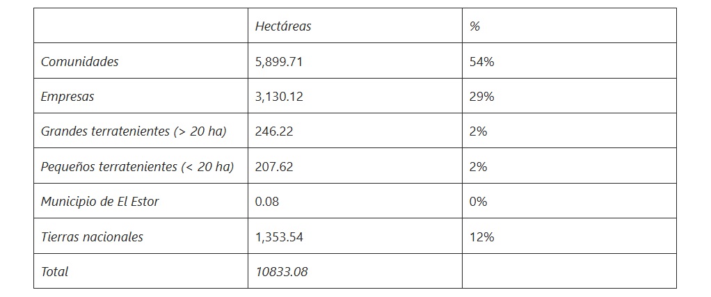 Tras la parcelación, más de la mitad de las tierras en la mira de CGN quedaron en manos de ocho comunidades diferentes, ya sea en régimen de copropiedad o como parcelas individuales (Tabla 2). Sin embargo, el 29% de esas tierras pertenece a cinco corporaciones y el 12% al Estado. Las comunidades que tienen título de propiedad pueden decidir –individual o colectivamente– si venden o no sus tierras a CGN, aunque cabe mencionar que en Guatemala no es raro que las élites utilicen cooptación y coerción para acceder a tierras comunales o despojar a campesinos individuales.