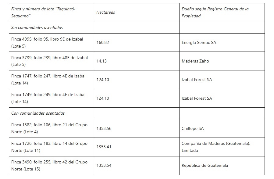 Lo más preocupante, sin embargo, es que tres de estas propiedades –dos corporativas y una estatal– son asentadas por comunidades Q’eqchi’s que carecen de certeza jurídica. Si el gobierno concede derechos de usufructo a CGN, o si los terratenientes venden a la empresa, es probable que surjan nuevos conflictos.