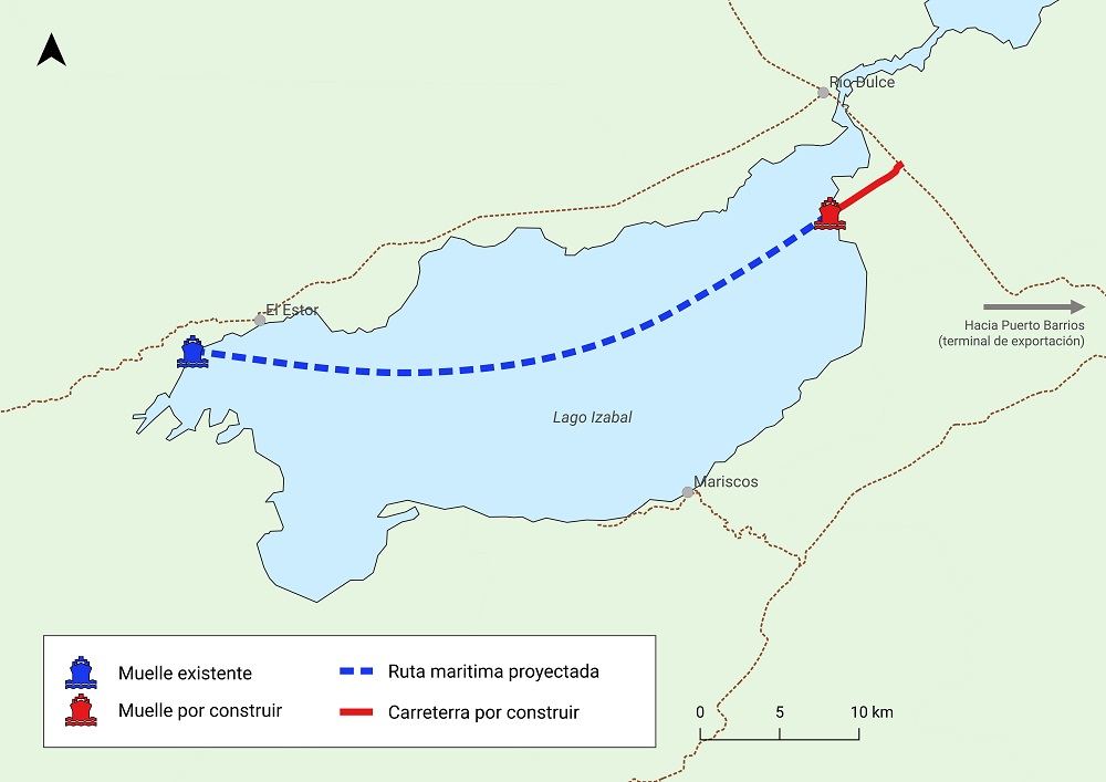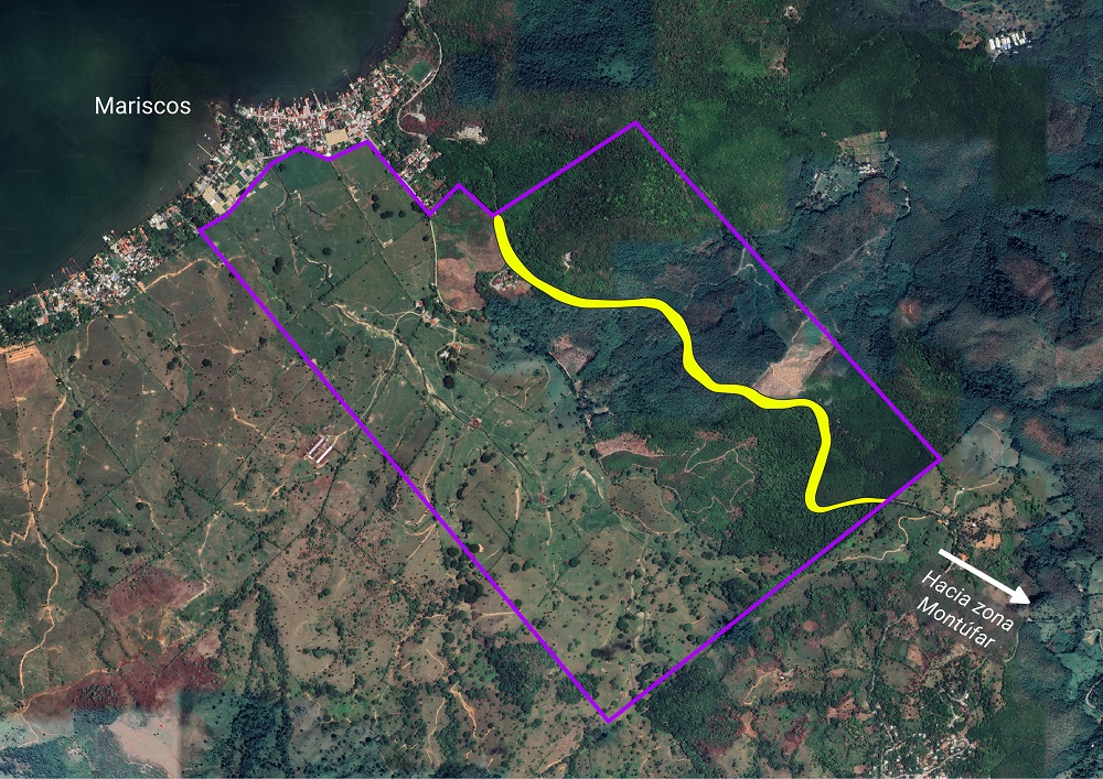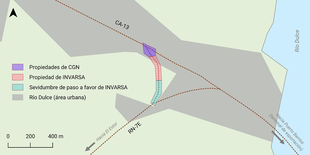 En primer lugar, CGN ha utilizado adquisiciones estratégicas de terrenos para controlar rutas de transporte clave. El desvío de Río Dulce —un enlace vital para transportar níquel desde la planta de procesamiento hasta la terminal de exportación en Puerto Barrios— está construido sobre parcelas compradas por la empresa (Figura 4). De manera similar, la carretera IZA-04, que conecta el poblado de Mariscos con la Carretera al Atlántico a través del sitio Montúfar, también se asienta sobre terrenos propiedad de CGN (Figura 5). Aunque son oficialmente carreteras públicas, el terreno subyacente pertenece a CGN, lo que probablemente facilitó su construcción. En un momento dado, la empresa también consideró adquirir un terreno en la orilla oriental del Lago de Izabal para construir una terminal de transporte acuático que permitiera trasladar materiales a través del lago, pero el plan nunca se concretó (Figura 6).