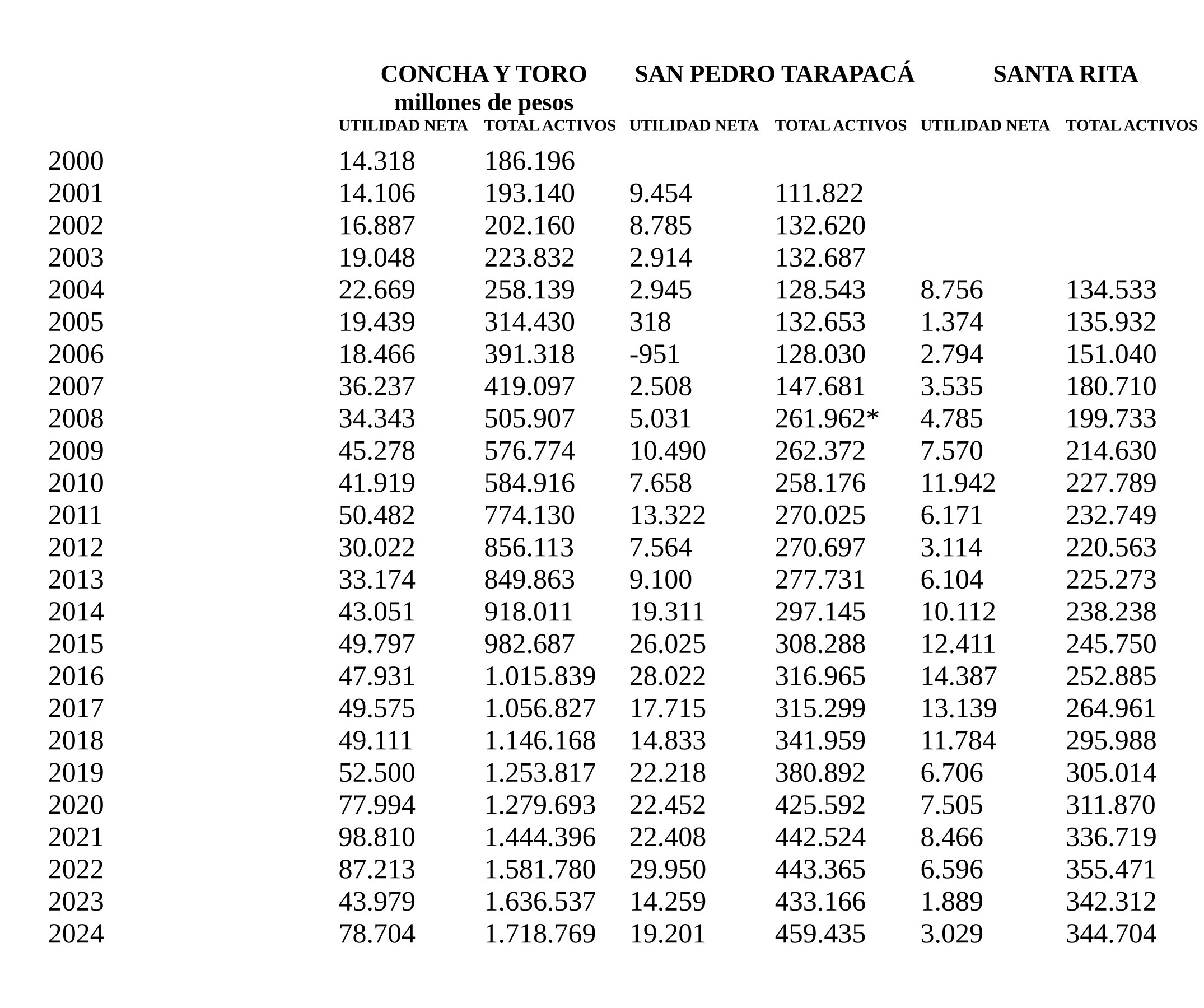 De acuerdo a su última memoria anual disponible (2024), Concha y Toro posee un total de activos de $1.718.769 millones, que representa un 70% más que el presupuesto del Ministerio de Agricultura de este 2026 ($1.019.695.771.000). La superficie agrícola que posee en Chile, Argentina y EE.UU. suma 14.031 hectáreas. Su catálogo de marcas abarca Concha y Toro, Tocornal, Santa Emiliana, Clos de Pirque Don Melchor, Marques de Casa Concha, Casillero del Diablo, Diablo, Frontera, Viña Maipo, Carmín de Peumo, Amelia, Terrunyo, Trio, Sunrise, Palo Alto, Sendero, Reservado Concha y Toro, SBX, Descorcha, Cono Sur, Bicicleta, Isla Negra, Ocio, 20 Barrels, Trivento, Eolo, Fetzer, Bonterra y 1000 Stories, en vinos. En cervezas incluye a Southern Brewing Company S.A. con su familia de marcas Kross, como son Krossbar, Kross Cervecería Independiente y Odissea.