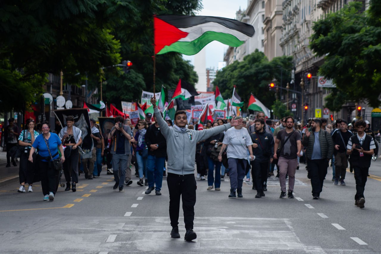 Marcha en la Ciudad de Buenos Aires el 11 de abril del 2026, un día antes de la salida de la flotilla, encabezada por Abdallah Mamdouh Tibi, Palestino de Gaza que actualmente vive en Buenos Aires. Fotografía: Andrés Manrique (ANRed).
