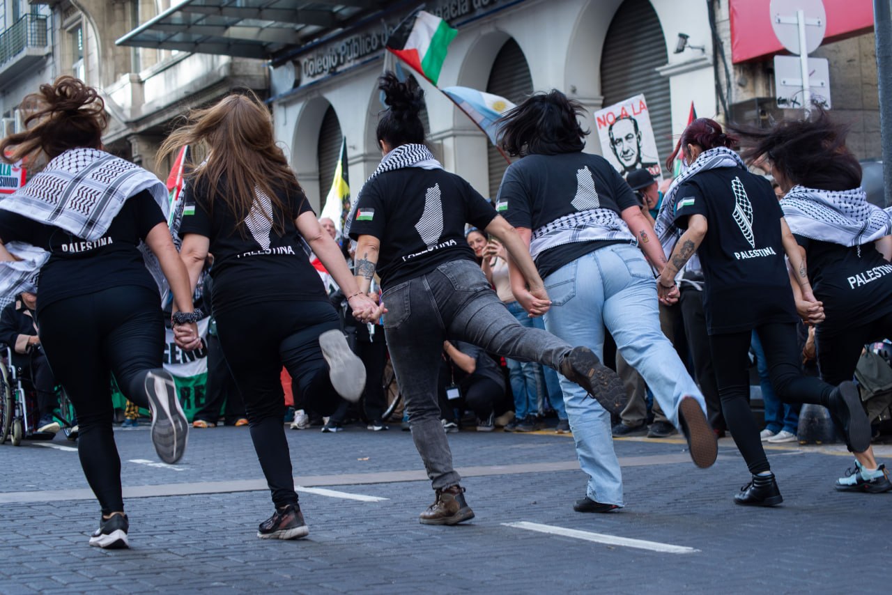Muestra de Dabke, danza palestina, en la marcha en la Ciudad de Buenos Aires el 11 de abril del 2026, un día antes de la salida de la flotilla. La actividad fue parte de las protestas y otras acciones a nivel global en solidaridad con la flotilla. Fotografía: Andrés Manrique (ANRed).