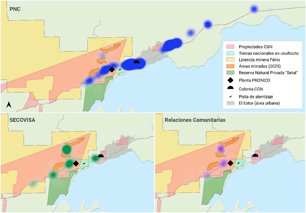 Mapas de calor mostrando los incidentes en los que se movilizó la PNC, SECOVISA (contratista de seguridad privada de CGN) y miembros del departamento de Relaciones Comunitarias. Obsérvese la división geográfica del trabajo: SECOVISA reacciona a incidentes en propiedad de la empresa mientras la PNC mayormente vigila carreteras públicas. El mapa de calor del departamento de Relaciones Comunitarias resalta por lo infrecuente que es su presencia en campo.