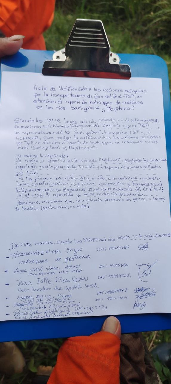 En 2025, el Servicio Nacional de Áreas Naturales Protegidas por el Estado (Sernanp) comprobó el vertido de residuos sólidos en los ríos Saringabeni y Mapitunari por las actividades de Transportadora de Gas del Perú, como consta en un acta firmada por dirigentes y trabajadores de la institución.