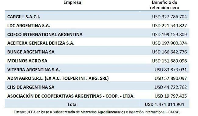 Tabla 1: Beneficio en dólares por empresa, producto del decreto de retención cero. Fuente: CEPA, en base a Subsecretaría de Mercados Agroalimentarios e Inserción Internacional - SAGyP.