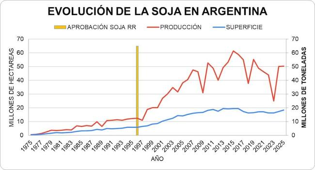 Dicha resolución se aprobó en marzo de 1996, por lo que recién en la campaña 1996/1997 se pudo multiplicar masivamente la soja con Organismo Genéticamente Modificado (OGM) para comercializar las semillas y, en la campaña 1997/1998, comenzó a sembrarse masivamente soja transgénica en Argentina. En aquel 1998, el rendimiento promedio a nivel nacional creció de 2 a 2,7 toneladas por hectárea y la superficie comenzó a crecer marcadamente. Así quedó conformado el paquete tecnológico del cultivo de la soja: siembra directa, herbicida glifosato y transgénesis aplicada a la oleaginosa.