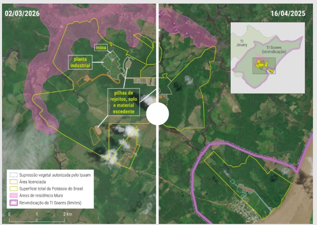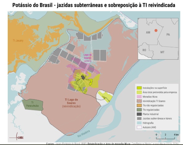 Um levantamento do Cimi Regional Norte 1 aponta que as jazidas subterrâneas do projeto Potássio Autazes, divulgada em mapas e relatórios produzidos pela própria empresa, abrangem uma área aproximada de 4,4 mil hectares também totalmente sobrepostos ao território Mura – inclusive aos locais de moradia dos indígenas, também mapeados pelo regional.