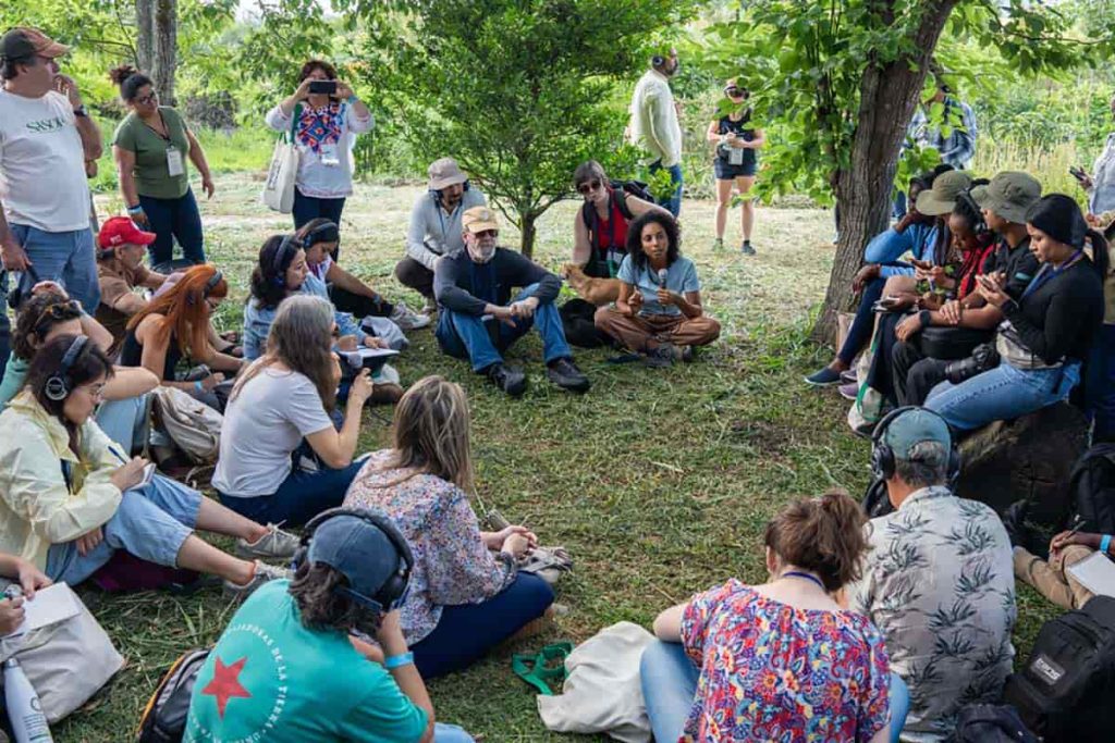 La joven oficia de guía en una visita de intercambio de saberes entre organizaciones de 16 países realizada en el marco de la Primera Reunión Internacional sobre Investigación-Acción Participativa para la Agroecología y la Incidencia Climática de la iniciativa IPA-Global, que convocó a activistas en favor de la agroecología y de la justicia climática provenientes de 16 países en Guararema (San Pablo, Brasil), a fines de 2025.