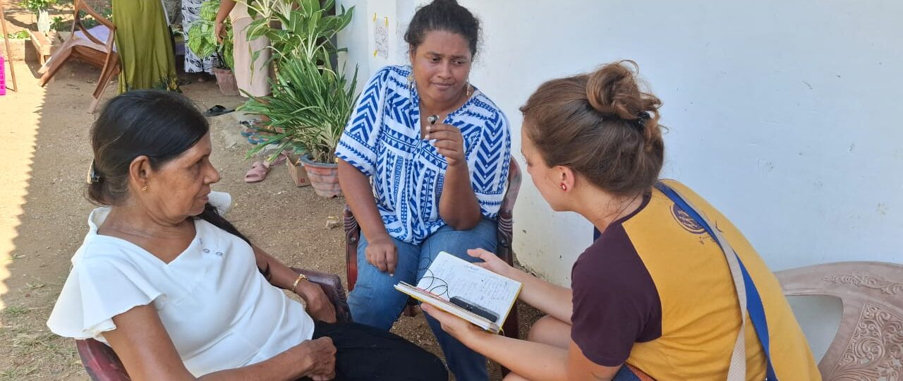 El mercado de microfinanzas en Sri Lanka se expandió drásticamente después de dos grandes crisis: el tsunami de 2004 y el fin de la guerra civil en 2009 (que duró 36 años). Las personas comenzaron a contraer préstamos con múltiples acreedores, que se multiplicaron a medida que la deuda se volvía un negocio lucrativo, mientras la economía enfrentaba dificultades para recuperarse. Las mujeres del Colectivo Vimukti también fueron directamente afectadas por la pobreza generalizada y la multiplicación de los préstamos. Nos sentamos en círculo, en sillas de plástico, afuera del espacio. Le preguntamos a Podimenike cómo estas empresas llegan a las aldeas para convencer a las mujeres de contraer préstamos: