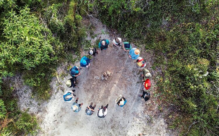 Familiares do Ir. Vicente Cañas, vindos da Espanha, em frente ao barraco onde o religioso morava, na Terra Indígena Enawenê-nawê (Foto: Renan Dantas)
