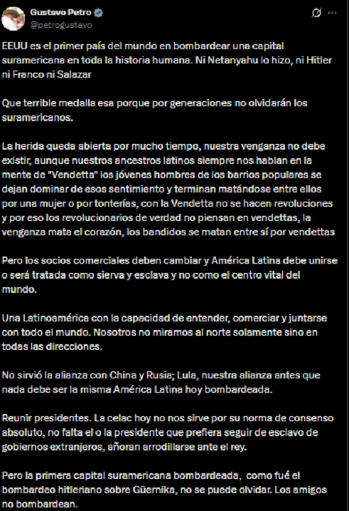 En sus declaraciones, Petro calificó la detención de Maduro como un secuestro y el ataque estadounidense como “aberrante”, señalando que destruye el Estado de derecho a nivel mundial y vulnera la soberanía de toda Latinoamérica y el Caribe.